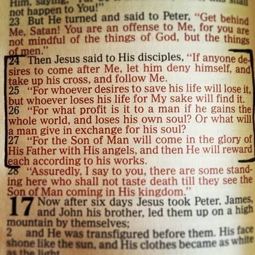 ‘And he said, “The Son of Man must suffer many things and be rejected by the elders, chief priests and teachers of the law, and he must be killed and on the third day be raised to life.” Then he said to them all: “If anyone would come after me, he must deny himself and take up his cross daily and follow me. For whoever wants to save his life will lose it, but whoever loses his life for me will save it. What good is it for a man to gain the whole world, and yet lose or forfeit his very self?’ Luke 9:22-25 (NIV)